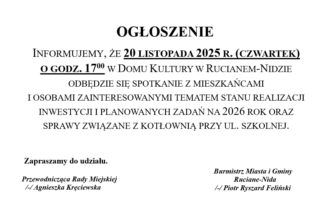 Informujemy, że 20 listopada 2025 r. (czwartek) o godz. 1700 w Domu Kultury w Rucianem-Nidzie odbędzie się spotkanie z mieszkańcami i osobami zainteresowanymi tematem stanu realizacji inwestycji i planowanych zadań na 2026 rok oraz sprawy związane z kotłownią przy ul. Szkolnej.