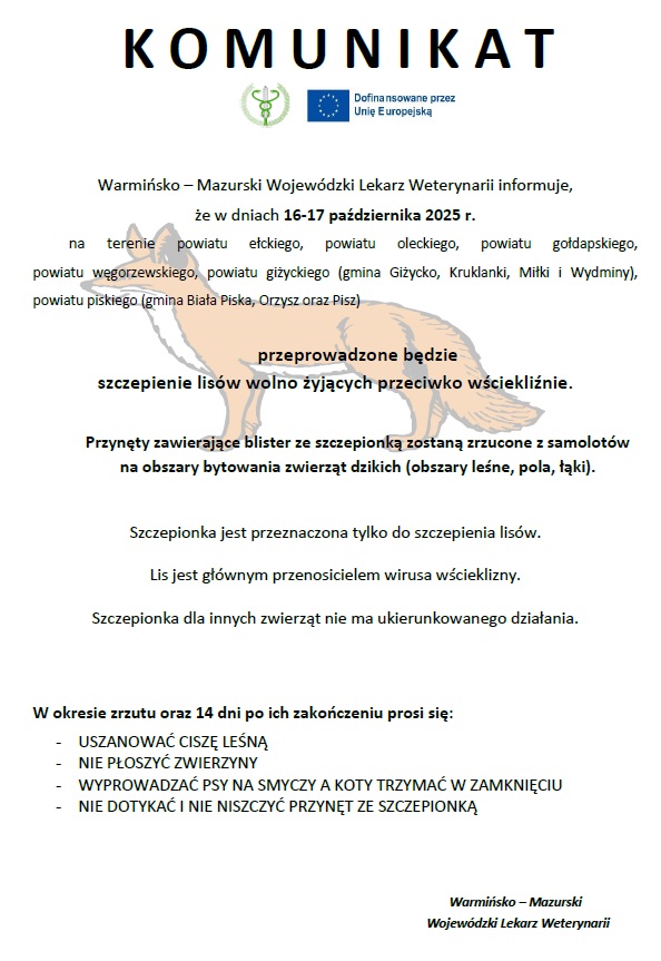 Warmińsko – Mazurski Wojewódzki Lekarz Weterynarii zawiadamia, że w zależności od warunków atmosferycznych, w dniach 16-17 października 2025 r. na terenie tutejszego województwa prowadzone będą szczepienia lisów wolno żyjących przeciwko wściekliźnie. Szczepieniami objęty zostanie teren następujących powiatów i gmin: powiat ełcki, powiat olecki, powiat gołdapski, powiat węgorzewski, powiat giżycki – gmina Giżycko, Kruklanki, Miłki i Wydminy, powiat piski – gmina Biała Piska, Orzysz oraz Pisz.