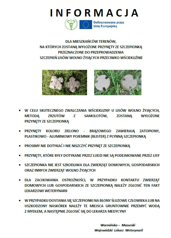 Warmińsko – Mazurski Wojewódzki Lekarz Weterynarii prosi o zachowanie dyscypliny w czasie trwania szczepień, jak również w okresie nabywania odporności przez zwierzęta tj. od 16 października do 31 października 2025 r. W szczególności apeluje się, aby nie płoszyć zwierzyny oraz nie podnosić i nie niszczyć przynęt ze szczepionką.