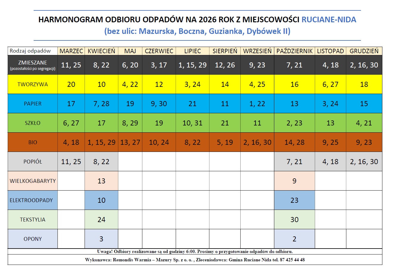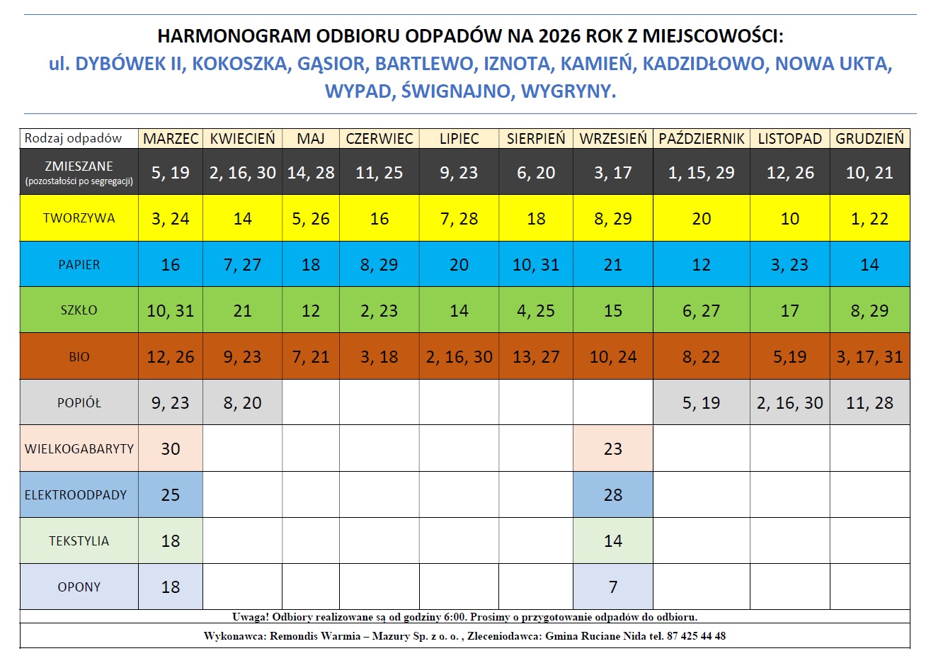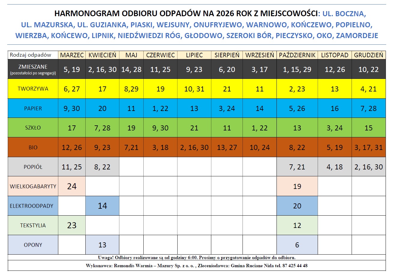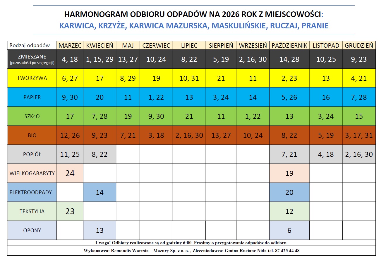 Harmonogram odbioru odpadów na rok 2026