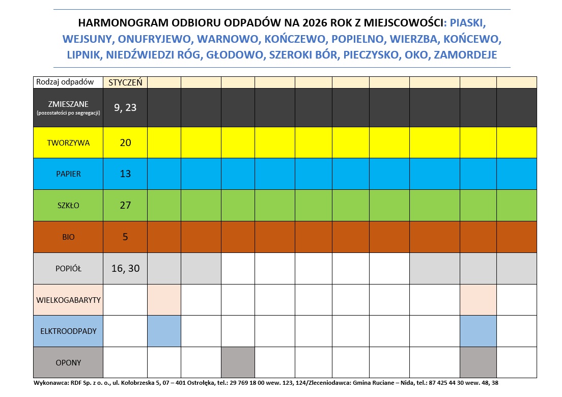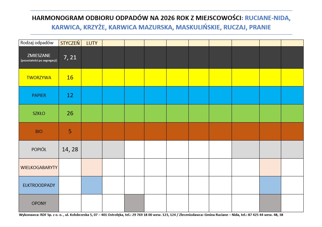 Harmonogram odbioru odpadów komunalnych w miesiącu styczniu 2026 r.