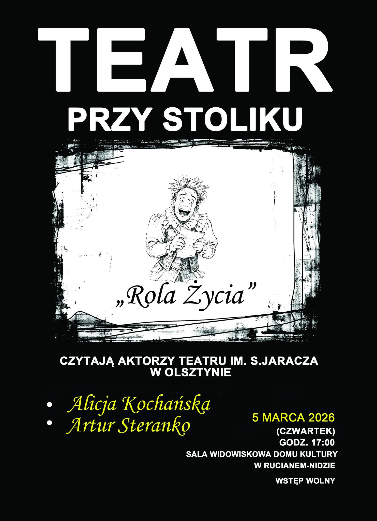 Już 5 marca 2026 r. (czwartek) o godz. 17:00 w sali widowiskowej Domu Kultury w Rucianem-Nidzie zapraszamy na Teatr przy stoliku.